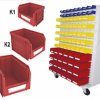 Contenitori sovrapponibili e cassettiere realizzati in resina termoplastica, carrelli con ruote e pannelli pensili di varie tipologie, dimensioni e colorazioni. Prodotti robusti e molto pratici adatti per diversi utilizzi, come ad esempio magazzini o negozi.