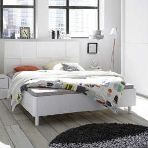 Letto dal design moderno, caratterizzato da rifiniture bianco laccato opaco con gioco dama sulla testiera e angolari curvi al giroletto. Prodotto ideale per camere da letto moderne anche con dimensioni ridotte.