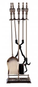Mod. OSVALDO in acciaio ottonato anticato, base rettangolare. Composto da 4 attrezzi e supporto. Altezza 78 cm