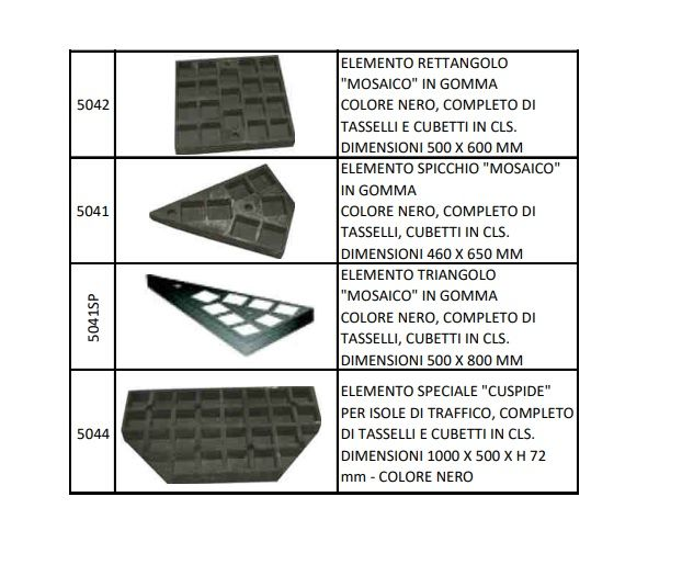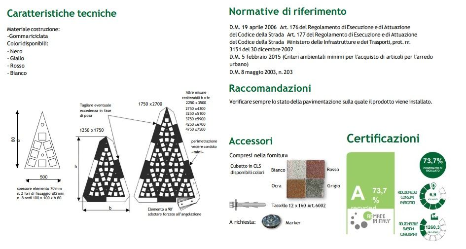 Le isole di traffico e salva pedone Mini sono delimitate esternamente dall'omonimo cordolo realizzato con gomma riciclata proveniente da pneumatici fuori uso. La parte esterna di Mini può essere rivestita con un elastomero poliuretanico di colore giallo, oppure può essere colorata con vernici poliuretaniche di altri colori. Al centro del cordolo lineare è possibile inserire un marker in cristallo. Il cordolo Mini è disponibile: lineare; 45 gradi; angolazione variabile; 90 gradi. La parte centrale delle isole è invece realizzata con il sistema brevettato Kubik, ossia con moduli in gomma riciclata dotati di alloggiamenti per l'inserimento di blocchetti in calcestruzzo (disponibili in diverse colorazioni). Le isole d’incanalamento alle rotatorie sono fondamentali per rallentare ed incanalare il traffico in prossimità di un incrocio. La parte perimetrale delle isole è delimitata dal cordolo Mini, all’interno del quale è possibile inserire un marker in cristallo. La parte interna è invece realizzata con gli elementi in gomma Kubik, articolo brevettato, dotati di alloggiamenti per l’inserimento di blocchetti in calcestruzzo. La modularità del prodotto consente la realizzazione di isole di diverse misure e forme.