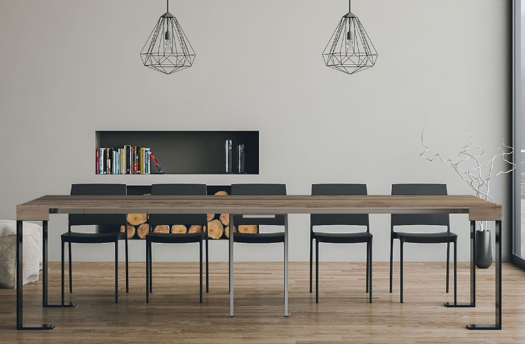 Tavolo / consolle allungabile modello Tecno, un concentrato di eleganza, stile, versatilità e design. In puro stile moderno, questa consolle può essere inserita in qualsiasi ambiente della casa, dall'ingresso alla camera da letto. La solidità della struttura il ferro con il piano in legno lavorato a Folding, rende la consolle robusta e stabile