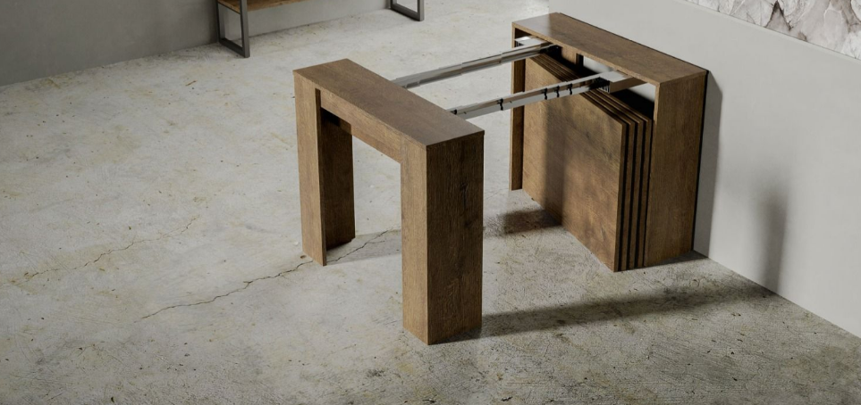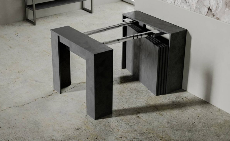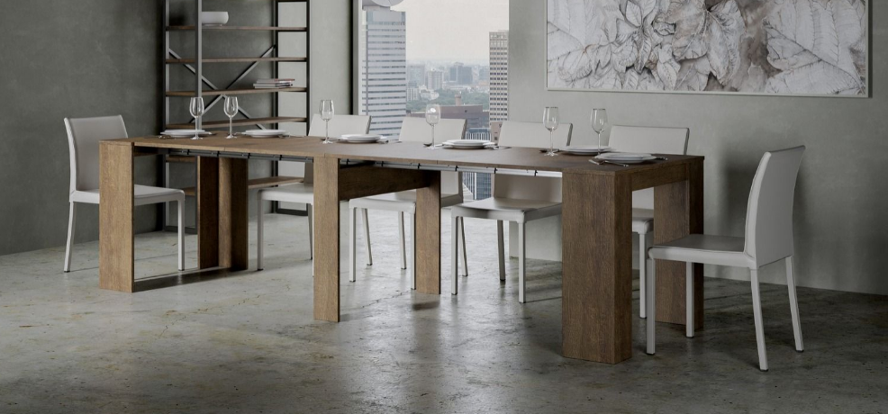 La consolle Venus è caratterizzata dalla semplicità delle sue forme. Le allunghe sono sempre e immediatamente disponibili; posizionabili a muro dietro la consolle, integrate nella struttura.