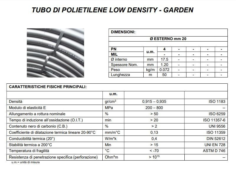 Il tubo Bassa Densità tipo irrigazione è prodotto con impianti di ultima generazione, utilizzando resine speciali selezionate, altamente resistenti agli agenti chimici e atmosferici. Per le caratteristiche di elevata resistenza allo stress meccanico è particolarmente indicato per derivazioni laterali e sopporto ottimamente le deformazioni provocate dal montaggio di innesti porta gomma. Pressione massima di esercizio 4 bar PN (indica la massima pressione di eserzio) 4.
