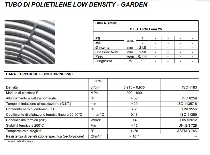 Il tubo Bassa Densità tipo irrigazione è prodotto con impianti di ultima generazione, utilizzando resine speciali selezionate, altamente resistenti agli agenti chimici e atmosferici. Per le caratteristiche di elevata resistenza allo stress meccanico è particolarmente indicato per derivazioni laterali e sopporto ottimamente le deformazioni provocate dal montaggio di innesti porta gomma. Pressione massima di esercizio 4 bar PN (indica la massima pressione di eserzio) 4.