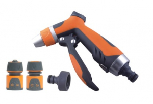 Hydro Pistola con regolazione della portata e del getto. Grilleto ergonomico con blocco automatico. Completa di 3 raccordi. Pistola da irrigazione utile e funzionale, nonchè molto comoda.