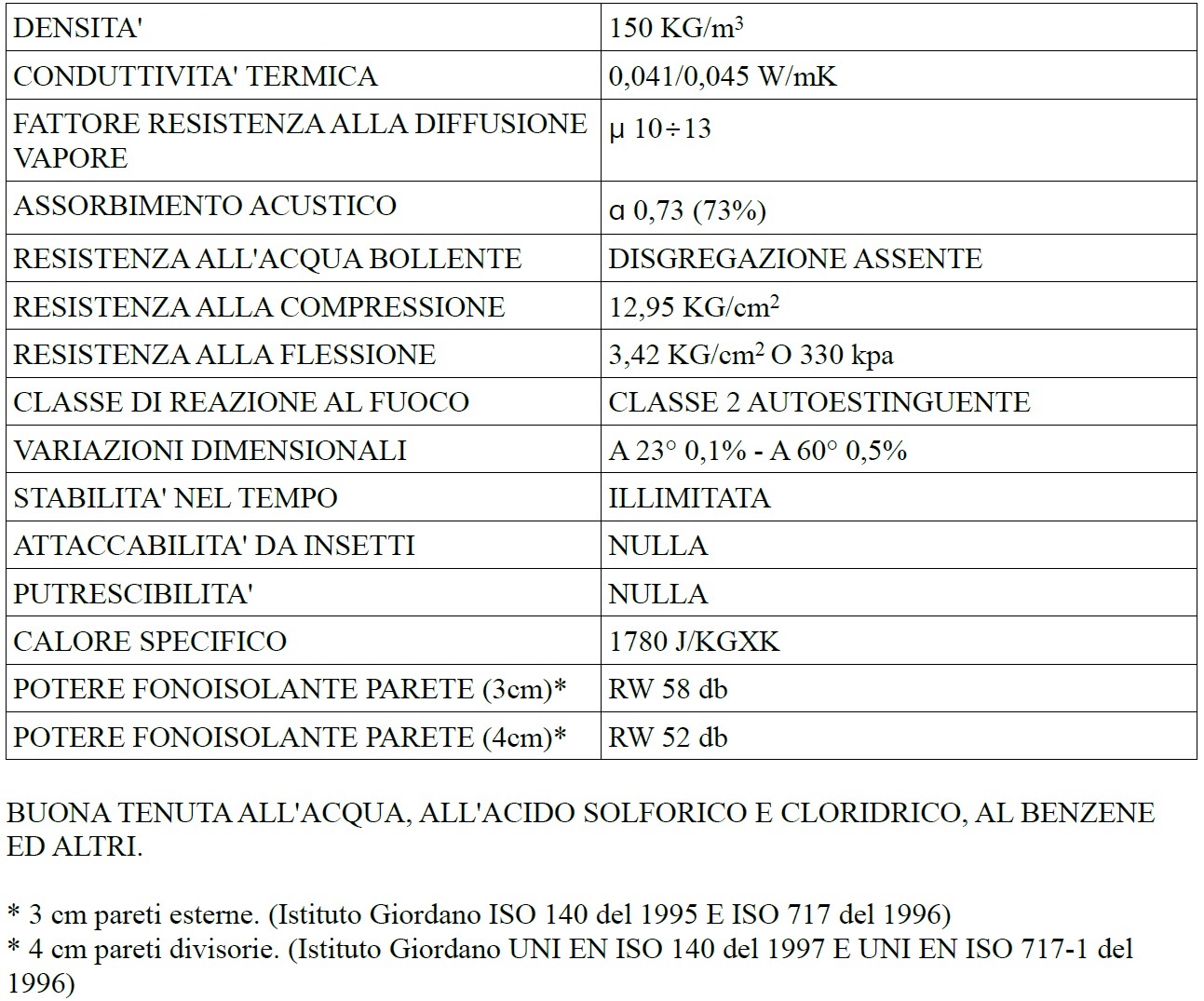 rischio di componenti radioemissivi assente, isolamento termico e acustico elevato, tossicità assente, emanazioni nocive assenti. NON rientra nell’elenco dei prodotti con l’obbligo di MARCATURA CE, infatti, attualmente, non vi è nessuna norma che consenta al sughero naturale “biondo” l’applicazione del marchio. Impermeabile all'acqua e permeabile al vapore, elevata densità ed elasticità, consente la pedonabilità del pannello, quindi una notevole resistenza alla compressione. Conforme ai criteri di compatibilità ambientale, bassa velocità di combustione, elettricamente neutro.