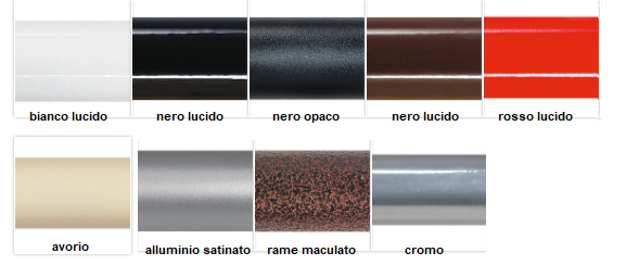Colori struttura a scelta tra: Alluminio Satinato, Avorio, Bianco Lucido, Cromo, Marrone Lucido, Nero Lucido, Nero Opaco, Rame Maculato, Rosso Lucido ( da comunicare al momento dell'acquisto)