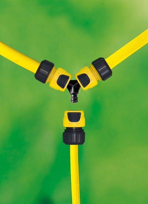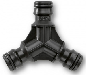 grande velocità e semplicità di montaggio. Completamente inossidabile in quanto privo di parti metalliche, resiste agli urti, alle intemperie, ai raggi solari e ad una pressione d'acqua elevatissima; fino a 40 bar, molto di più del normale utilizzo per il giardinaggio domestico. Raccordo a tre vie per collegare facilmente e velocemente 3 tubi. Design robusto. Compatibile con tutti i sistemi a click presenti sul mercato. In plastica dura e resistente.