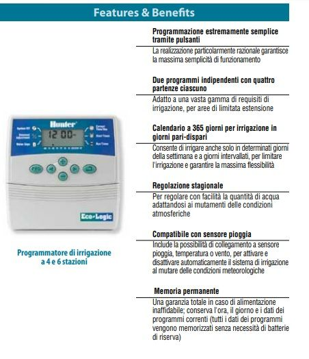 Centralina programmatore Hunter a 4 stazioni per irrigazione di prati,giardini,orti e irrigazione a goccia. Il nome racchiude in sè l'importanza che gli ingegneri Hunter hanno riservato agli aspetti ecologici e di risparmio idrico nella progettazione della centralina Hunter Eco Logic a 4 stazioni. Unisce le funzioni più comuni ad un design compatto e piacevole disponendo di tutte le funzioni necessarie per il proprio impianto d'irrigazione. Per risparmiare un liquido così prezioso come l'acqua, il seguente prodotto offre un'ottima gestione idrica. Eco - Logic. L'affidabilità di un prodotto testato da anni si concretizza in un tasso di reso in garanzia vicino allo zero. Eco come ecologia, perché è dotato delle funzioni di gestione idrica essenziali più complete in un programmatore estremamente conveniente. Logic come logica, perché è progettato per la comodità e la semplicità di utilizzo, per la massima flessibilità e il massimo controllo possibile.