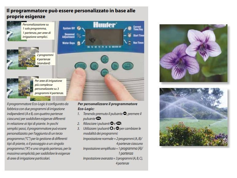 Risparmio idrico assicurato: la centralina Hunter Eco logic a 4 stazioni, attraverso un semplice pulsante, permette di ridurre l'irrigazione fino al 10% o aumentarla fino al 150% a seconda del periodo, senza dover riprogrammare i tempi delle singoli stazioni.