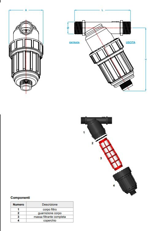 - Pressione di esercizio massima: 10 bar a 20° - Grado di filtrazione standard: 120 mesh - Derivazione standard: filettro mascio [BSP e NPT] - Il filtro può essere fornito con coperchio otturato ( senza spurgo ) o forato ( con spurgo ) con tappo filettato - Resistente ad acidi e fertilizzanti comunemente utilizzati in agricoltura