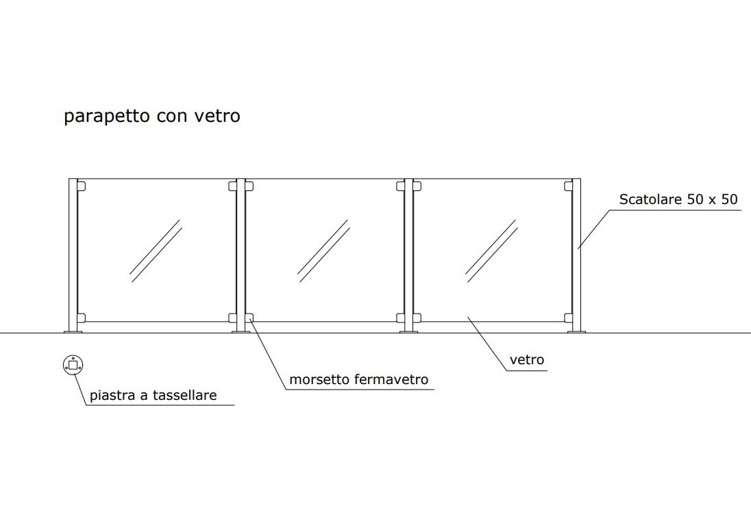 Materiale su commissione, di tempi di consegna possono variare di 4/5 ggCaratteristiche: Parapetto balaustra vetro/metallo da abbinare con relative piantane H 1050 da pavimento realizzata come segue: montanti in 50*50*3 in acciaio zincato verniciati a polveri finitura RAL ( da scegliere ) con relativi morsetti per vetro in zamac finitura inox satinato; lastre di vetro float 55.4 stratificato e temperato. Certificazione di prova resistenza al carico statico orizzontale ( D.M. 14.01.2008 – tabella 3.1.II Cat. F; UNI 10806:1999 )