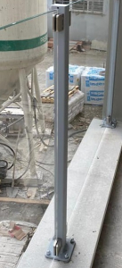 Caratteristiche: Piantana intermedia in acciaio zincato 50*50*3 H 1050 con ancoraggio a pavimento e corredata di N 4 morsetti in zamac finitura inox satinato. Piantana verniciata a polveri RAL standard