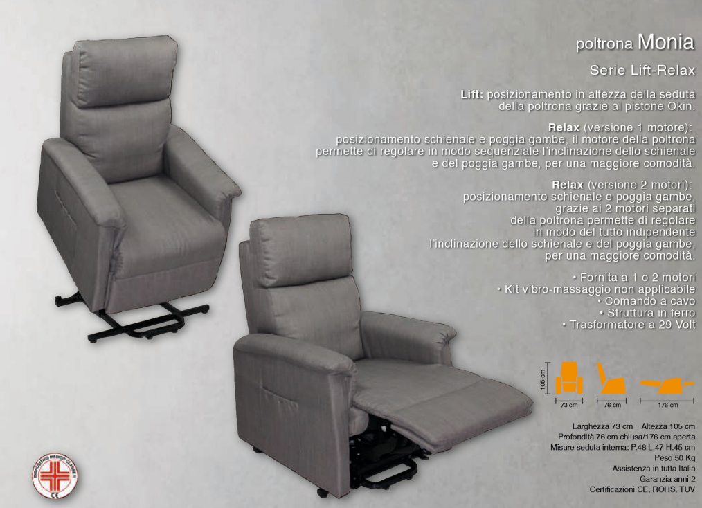 Lift: posizionamento in altezza della seduta della poltrona grazie al pistone Okin. Relax: posizionamento schienale e poggia gambe, nella versione ad 1 motore il pistone della poltrona permette di regolare in modo sequenziale l'inclinazione dello schienale e del poggia gambe mentre nella versione a 2 motori i 2 pistoni separati della poltrona permettono di regolare in modo del tutto indipendente l'inclinazione dello schienale e del poggia gambe (reclinazione a 180° "posizione letto") - Fornita ad 1 motore e a 2 motori - Seduta sfoderabile - Kit vibro-massaggio non applicabile - Comando a cavo - Struttura in ferro - Trasformatore a 29 Volt. - Dotata di 2 rotelle posteriori.