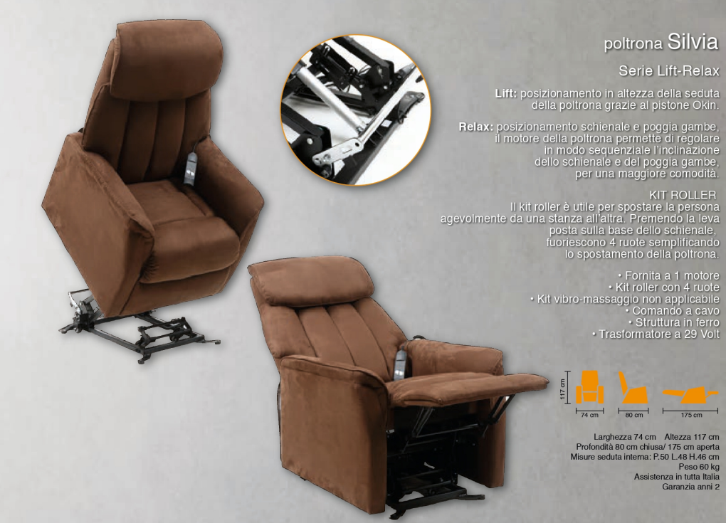 Lift: posizionamento in altezza della seduta della poltrona grazie al pistone Okin. Relax: posizionamento schienale e poggia gambe, il motore della poltrona permette di regolare in modo sequenziale l'inclinazione dello schienale e del poggia gambe, per una maggiore comodità.