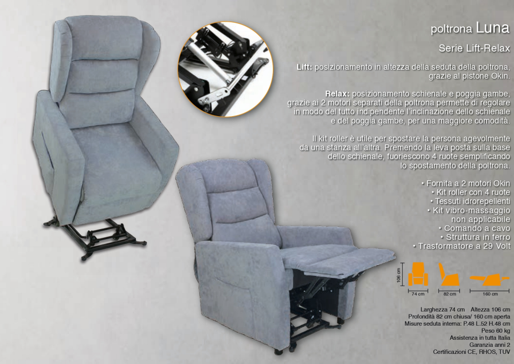 Lift: posizionamento in altezza della seduta della poltrona, grazie al pistone Okin supporta un'alzata massima di 150 kg. Relax: posizionamento schienale e poggia gambe, grazie ai 2 motori separati della poltrona permette di regolare in modo del tutto indipendente l’inclinazione dello schienale e del poggia gambe, per una maggiore comodità. Completa di KIT ROLLER - Fornita a 2 motori - Tessuti idrorepellenti - Kit vibro-massaggio non applicabile