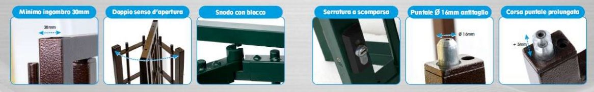 Migliora il livello di sicurezza senza modificare i serramenti esistenti; Doppio senso di apertura per poter aprire le grate sia verso l'interno che verso l'esterno; Struttura del telaio in scatolai di acciaio 30x30 mm,con montanti dell'anta 30x50 mm, con tondi pieni verticali di 16 mm e piatti orizzontali da 10 mm; Le serrature possono essere a doppia mappa o a cilindro europeo, con maniglia anche estraibile; Presenta un puntale antitaglio di 16 mm di diametro con corsa prolungata di 5 mm e struttura conica per facilitarne la chiusura.