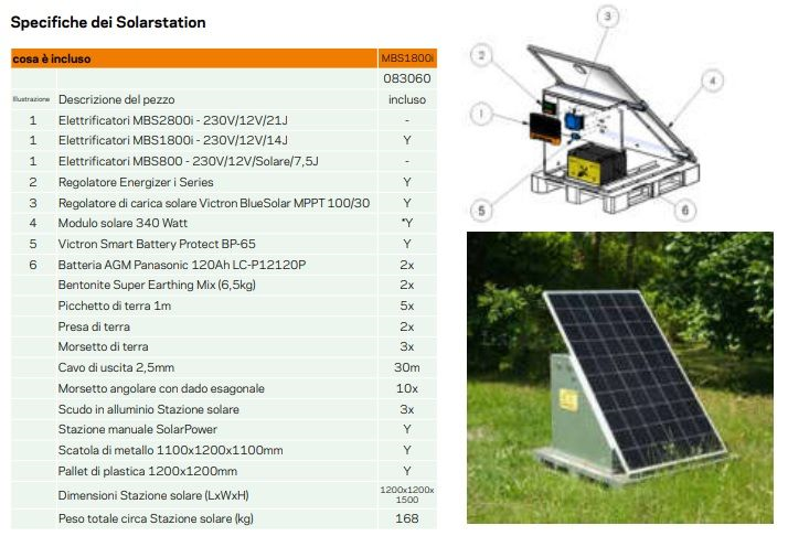 - Elettrificatore MBS1800i - Regolatore Energizer i Series - Regolare di carica solare Victron BlueSolar MPPT 100/30 - Modulo solare 340 Watt - Victron Smart Battery Protect BP-65 - 2x Batteria AGM Panasonic 120Ah LC-P12120P - 2x Bentonite Super Earthing Mix (6,5 Kg) - 5x Picchetto di messa a terra 1 m - 2x Presa di terra - 3x Morsetto di terra - 30 m Cavo di uscita 2,5 mm - 10x Morsetto angolare con dato esagonale - 3x Scudo in alluminio Stazione solare - Manuel Stazione Solarpower - Scatola di metallo 1100x1200x1100 mm - Pallet di plastica 1200x1200 mm