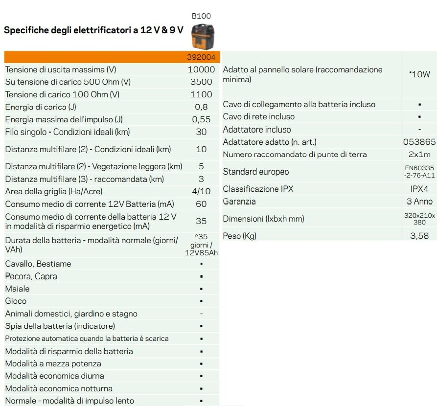 Potente elettrificatore a batteria indicato per batterie da 9 e 12 V. Adatto per recinzioni fino a 10 km. Dotato di indicatori luminosi di carica della batteria e tensione della recinzione. Quattro possibilità di regolazione per ridurre il consumo della batteria permettono di prolungare la vita della batteria fino a 12 mesi. Ideale per essere alimentato a energia solare. Soluzione perfetta per le recinzioni elettrificate nel settore dell'allevamento e della zootecnia, con un eccellente rapporto qualità-prezzo. Caratteristiche