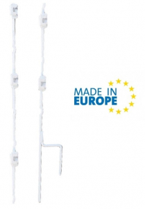 Picchetto in metallo elastico, robusto e leggero, dotato di 4 isolatori removibili. Il doppio piede lo rende facile da installare e molto stabile. Il rivestimento plastico bianco lo redne molto visibile ed evita cortocircuiti. Altezza 87,5 cm.