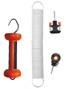 Set completo per realizzare un cancello a molla adattabile a passaggi larghi fino a 5 metri. Un’eccellente visibilità è assicurata dai colori brillanti della molla bianca e della maniglia arancione. Si ritrae fino alla posizione di partenza. Sconsigliato con i cavalli.
