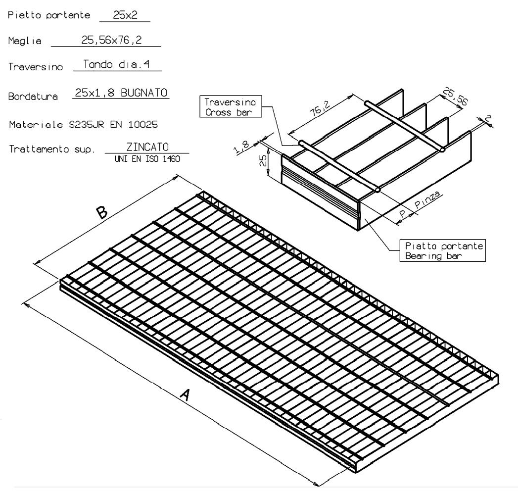 PANNELLO GRIGLIATO ZINCATO A CALDO MAGLIA 25X76 mm. ELETTROFORGIATO CALPESTABILE Varie Misure