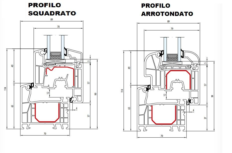 E' possibile scegliere tra due tipi di profilo : SQUADRATO e ARROTONDATO , sia per l'anta che per il fermavetro.