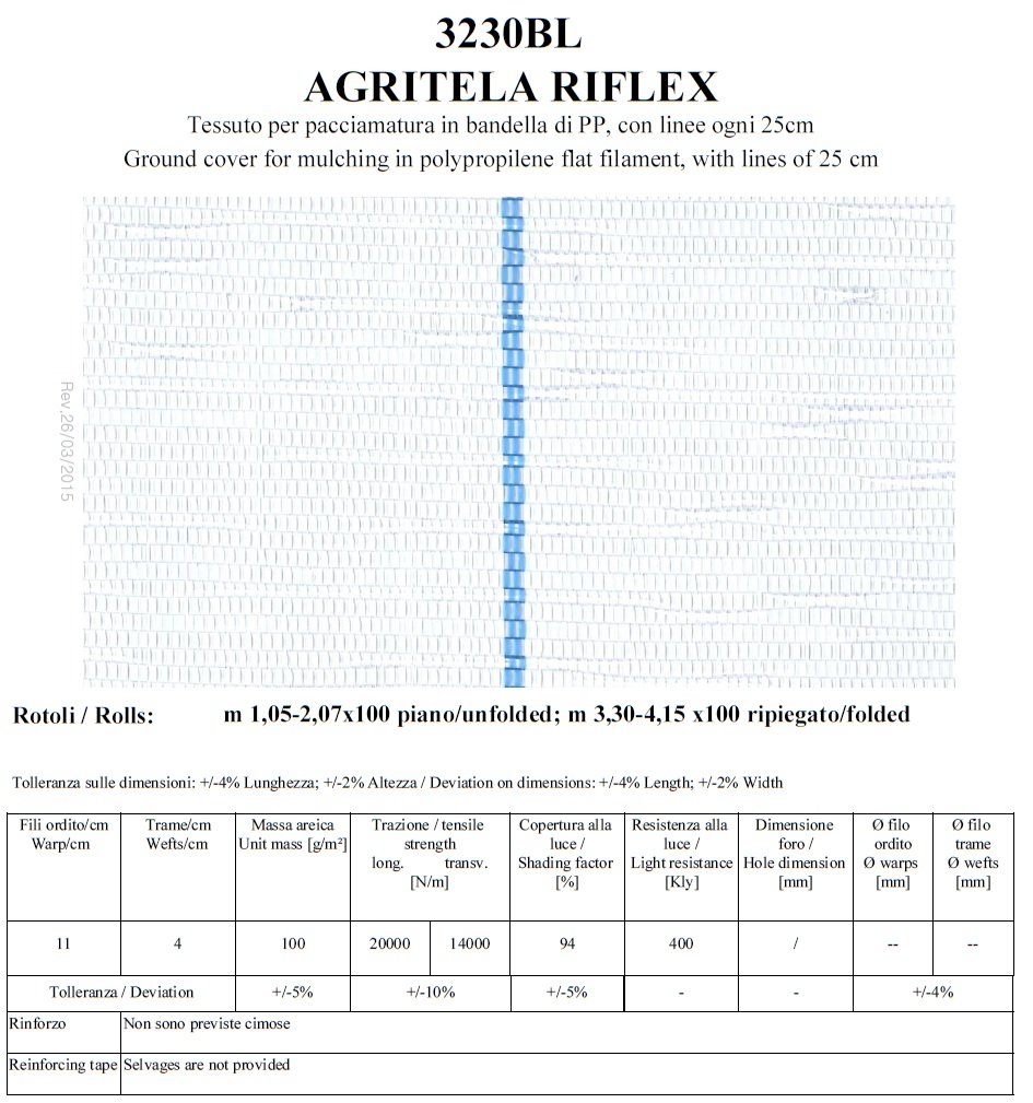 Tela utilizzata nei vivai. Impedisce la crescita di erbe infestanti. Quadrettatura verde con lato da cm 15, peso gr 100/mq, colore Bianco. Tessuto per pacciamatura robusto e poroso, in polipropilene stabilizzato ai raggi UV. Assicura il passaggio dell'aria mantenendo il terreno sottostante biologicamente vivo, inoltre l'acqua in eccesso filtra lentamente attraverso il tessuto evitando ristagni. Libera il terreno dalle piante infestanti senza impiegare diserbanti chimici. Può essere utilizzata più volte ed è resistente al calpestio