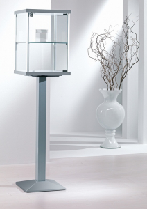Vetrina con montanti in alluminio – cristalli temperati – no. 1 anta battente con serratura – con piantana in metallo. Dimensione: 45x45xh153, peso 45 kg, colli 2 – no. 1 ripiano regolabile in altezza