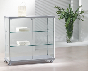 Banco/Vetrina 93/B - dimensioni 93x39x92H- con 2 ripiani regolabili in altezza, ante con serratura, con ruote piroiettanti.