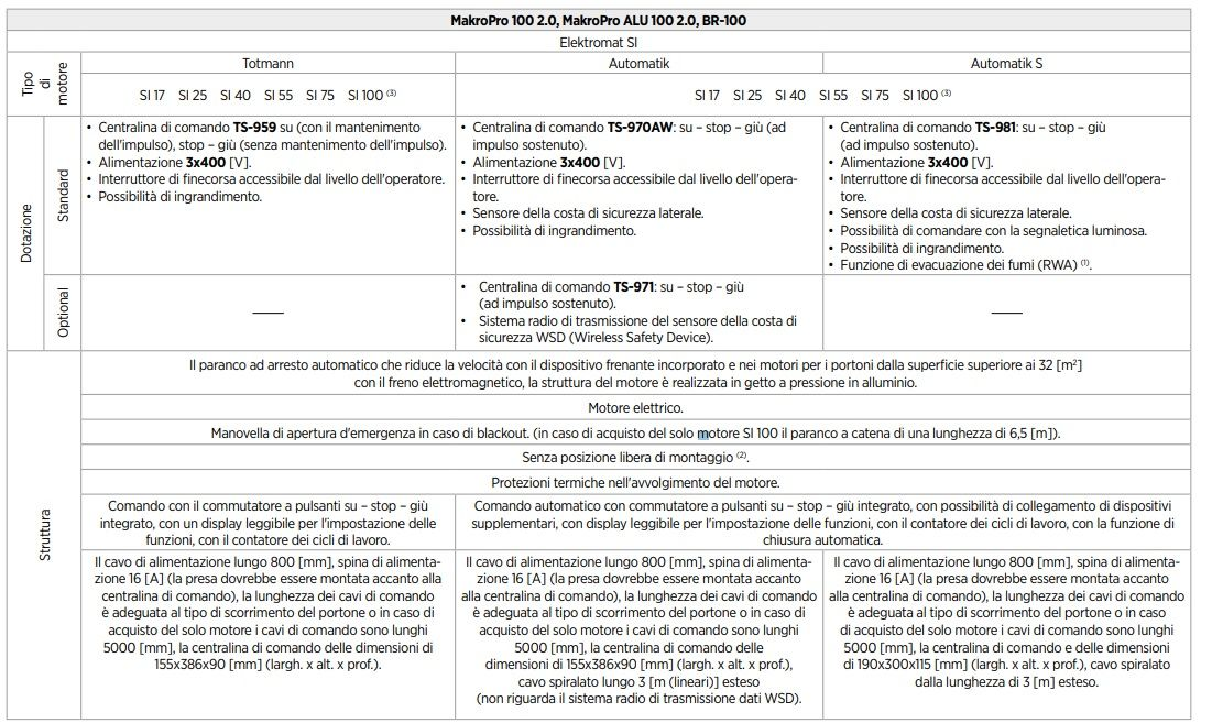 I motori Elektromat SI: Totmann, Automatik, Automatik S previsti per i portoni industriali sezionali MakroPro 100 2.0, MakroPro ALU 100 2.0 e per le serrande avvolg ibili BR-100. Il motore è montato sull'albero in acciaio, sul quale sono montati i tamburi di avvolgimento. Il motore muove la serranda mettendo in moto l'albero in acciaio. La scelta del motore dipende dalla superficie dell'anta del portone e viene effettuata dal produttore in fase di realizzazione del portone.