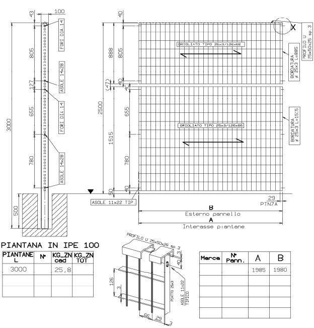 Le piantane sono costruite in profilo IPE 100 composte dalla parte verticale lunga 3000 mm, dotate di opportune forature ed asole per il fissaggio dei pannelli.