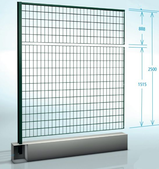 La recinzione in grigliato elettrosaldato modello per campi sportivi è composta da due pannelli. I due pannelli sono costruiti con profili orizzontali piatto 25x3 mm posti ad un interasse di 126 mm. I collegamenti sono costituiti da tondi Ø 4,5mm aventi interasse di 66mm. Le bordature verticali sono realizzate in piatto 25x3mm, dotate di opportune forature al fine di creare un supporto per il fissaggio alle piantane. Il pannello superiore e quello centrale sono rinforzati con un profilo a U 25x50x25 sp.3mm nella parte superiore.