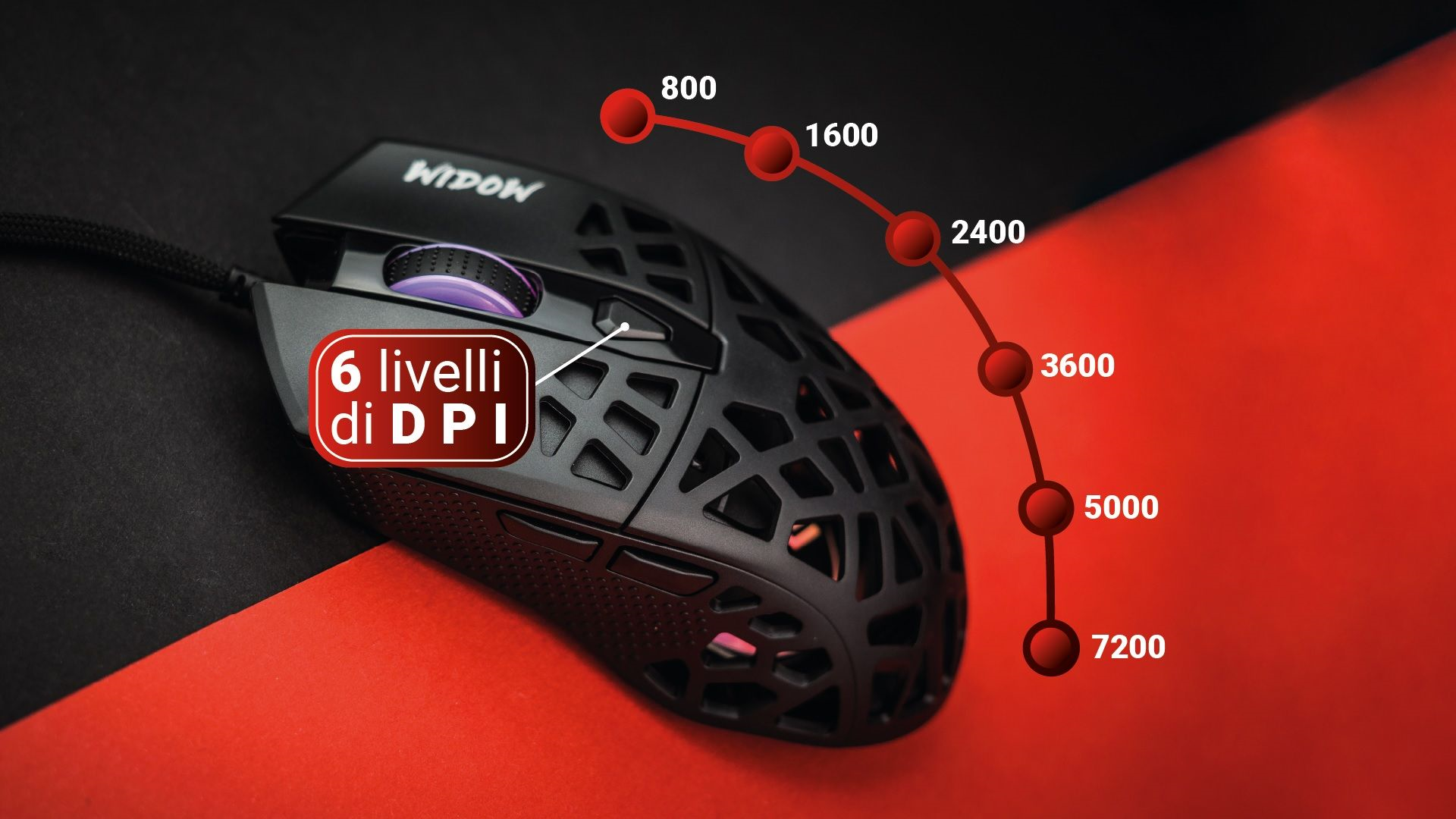 Caratterizzato da 6 livelli DPI: 800,1600,2400,3600,5000,7200. Tracciamento perfetto dei pixel, accelerazione del mouse zero, frequenza di polling di 1000 Hz.
