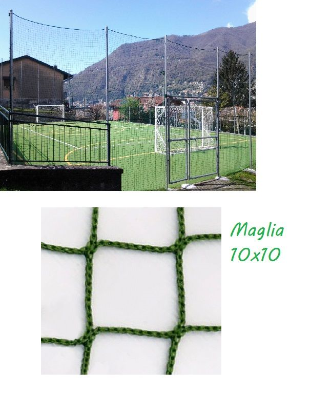 Materiale : Polietilene stabilizzato contro i raggi Uv , idrorepellente , realizzata con treccia da mm. 3 (12 fili di diametro mm. 0,35) Maglia: cm 10 X 10 Colore : Verde Peso: g. 60/mq ca. Ideale per campi da calcio