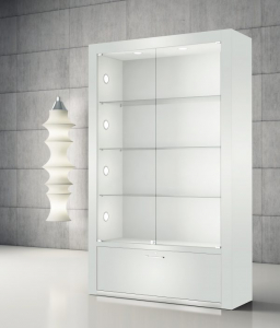 Vetrina con spalle in legno con 10 faretti LED integrati nelle spalle e nel top , 2 ante battenti e 3 ripiani in cristallo temperato , cassettone di base e schienale in laminato bianco.