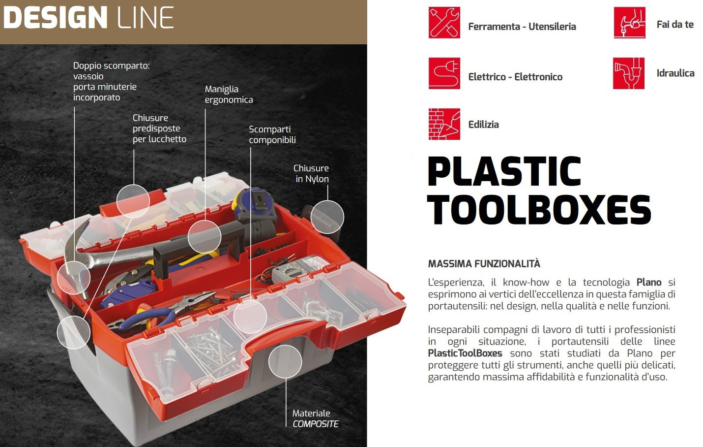 La cassetta portautensili fa parte della linea Plano "Design Line" creata in collaborazione con F.A. Porsche ed è ideale come contenitore professionale per articoli di ferramenta, utensileria, elettrici, elettronici e per il fai da te. La Cassetta porta attrezzi PLANO 959 realizzata in polipropilene è dotata di un vano portatrapano con gommapiuma e un vano portaminuterie suddiviso in 16 scomparti di diverse dimensoni.