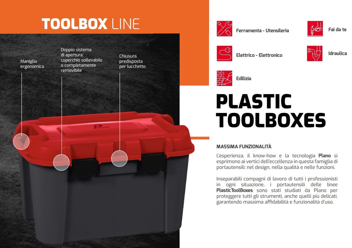 La cassetta/baule portautensili fa parte della linea Plano "Toolbox Line" è ideale come contenitore professionale per articoli di ferramenta, utensileria, elettrici, elettronici e per il fai da te. La Cassetta/baule porta attrezzi PLANO Giotto realizzata in polipropilene è dotata di doppio sistema di apertura con coperchio completamente removibile, con 4 chiusure per lato. Chiusura predisposta per lucchetto.