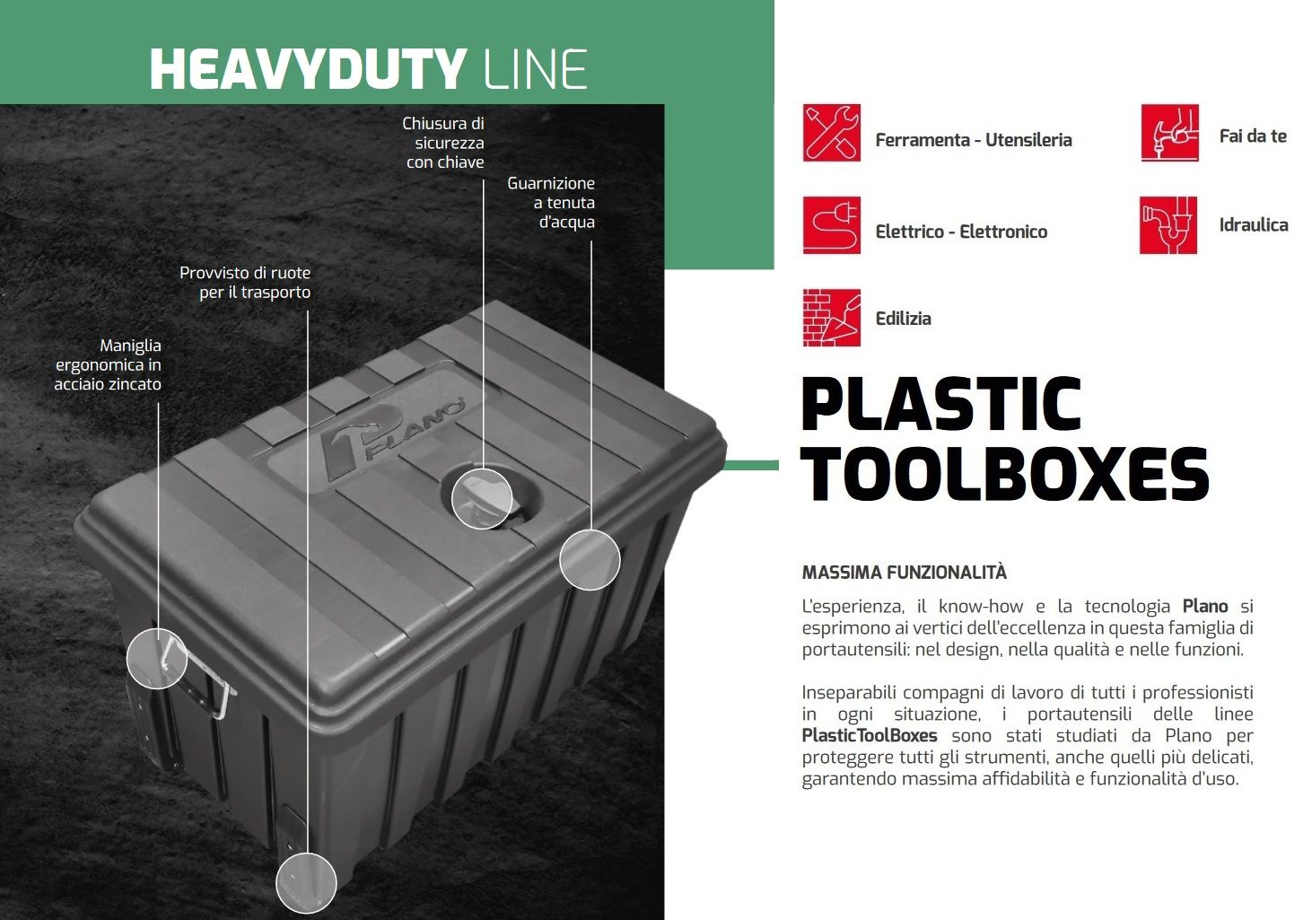 Il Baule Portautensili fa parte della Plano "Heavyduty Line" è ideale come contenitore professionale per articoli di ferramenta, utensileria, elettrici, elettronici. Il baule porta attrezzi PLANO HDP60 realizzato in polipropilene, è dotato di chiusura di sicurezza con chiave e maniglie in metallo zincato.