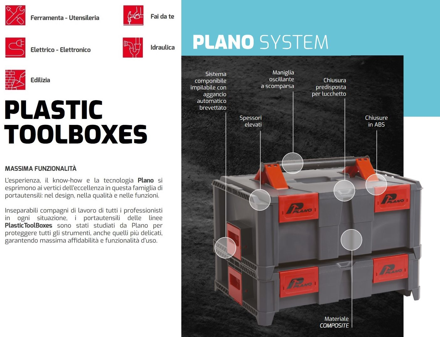La cassetta Portautensili fa parte della Plano "System Line" è ideale come contenitore professionale per articoli di ferramenta, utensileria, elettrici, elettronici e fai da te. La cassetta porta attrezzi componibile PLANO System Organizer 1 realizzato in polipropilene, è dotato di un particolare aggancio brevettato automatico.