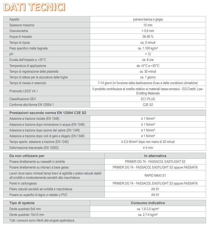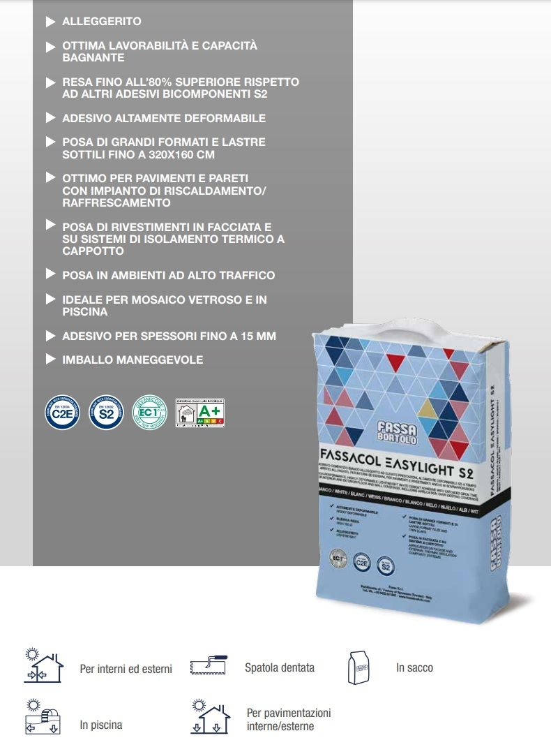 FASSACOL EASYLIGHT S2 viene impiegato per incollare piastrelle in ceramica di ogni tipo quali klinker, monocottura, bicottura, cotto, gres porcellanato anche in lastre a basso spessore. Idoneo anche per l’incollaggio di mosaici sia di tipo ceramico che vetroso (versione bianca), ricomposti a base cemento e pietre naturali non sensibili alla macchiatura e stabili all’umidità. É idoneo alla posa di rivestimenti di qualsiasi dimensione e spessore sia all’interno che all’esterno. I supporti possono essere: intonaci di fondo a base di calce, cemento, gesso e malte bastarde, massetti cementizi o a base anidrite ben stagionati ed asciutti, solette in calcestruzzo ben stagionate, cartongesso, guaine cementizie, pavimenti esistenti (in ceramica, marmo, parquet, ecc.), compensato marino, legno multistrato ed agglomerati legnosi con basso assorbimento di acqua e stabili. Idoneo per la posa su intonaci e massetti con impianto di riscaldamento/raffrescamento, su sistemi di isolamento termico a cappotto FASSATHERM, in piscina, in facciata esterna, lastricati solari ed in generale per ambienti con forti sollecitazioni meccaniche, termiche e vibrazioni. Altamente indicato, vista la perfetta compatibilità dei materiali, su massetto SA 500, E 439, SV 472, SV 472 P, SR 450, LEGEO MIX, FASSAFLOOR THERM, massetti realizzati con legante FASSACEM, su impermeabilizzanti della linea AQUAZIP e su lastre del sistema a cartongesso GYPSOTECH.