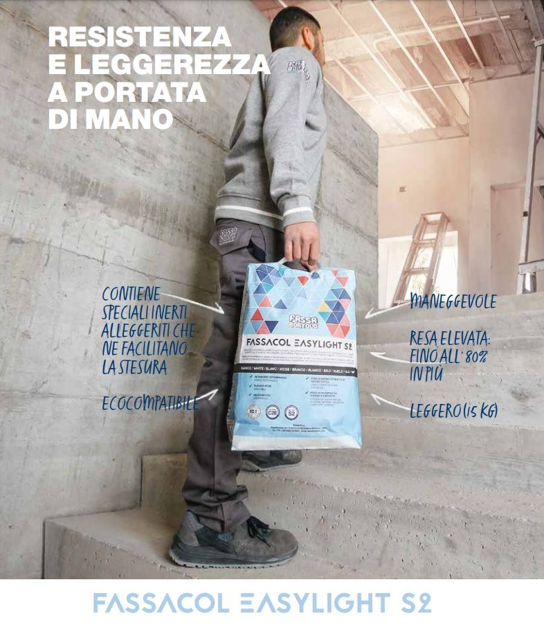 FASSACOL EASYLIGHT S2 è un adesivo premiscelato secco composto da cemento Portland bianco o grigio, sabbie scelte bianche o grigie, inerte alleggerito con granulometria selezionata, un elevato quantitivo di resine sintetiche ed additivi specifici per migliorare la lavorazione e l'adesione.