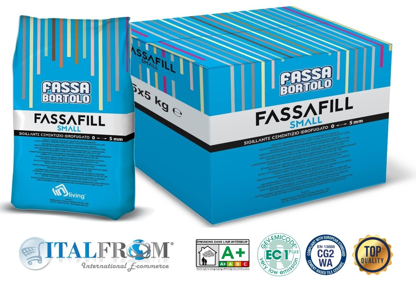 FASSAFIL SMALL è un sigillante cementizio contenente cementi speciali, sabbie selezionate e additivi idrofobizzanti. FASSAFIL SMALL è protetto dallo sviluppo di un ampio spettro di specie di muffe ed alghe.