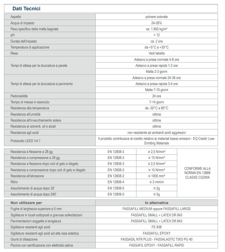 - Non utilizzare FASSAFILL SMALL come giunto di dilatazione o di frazionamento, anche quando impastato con il lattice LATEX DR 843.