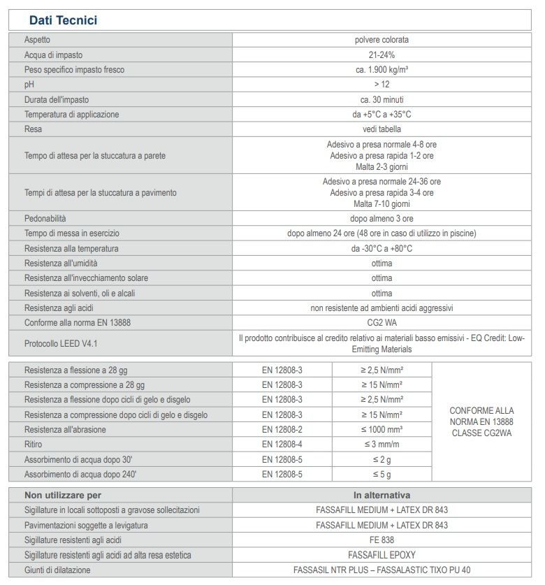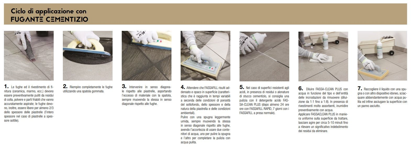 Aggiungere il 21-24% di acqua pulita a seconda della consistenza desiderata in base all'applicazione da effettuare (pavimenti o rivestimenti). Mescolare a mano o con agitatore meccanico a basso numero di giri per evitare di inglobare aria fino ad ottenere un impasto omogeneo e privo di grumi. L'impasto così ottenuto è lavorabile per circa 30 minuti. Attendere 2 minuti, rimescolare e riempire completamente le fughe utilizzando una spatola gommata o racla. Intervenire in senso diagonale rispetto alle piastrelle, asportando l'eccesso di materiale con la spatola, sempre muovendo la stessa in senso diagonale rispetto alle fughe. Dopo che FASSAFILL RAPID risulta addensato e opaco in superficie (caratteristica che è raggiunta in tempi variabili a seconda delle condizioni di porosità del sottofondo, dello spessore e della natura della piastrella e delle condizioni ambientali), pulire con una spugna leggermente umida, sempre muovendo la stessa in senso diagonale rispetto alle fughe, avendo l'accortezza di usare due contenitori di acqua, uno per pulire la spugna e l'altro per completare la pulizia con acqua pulita. Mantenere uniforme il grado di bagnatura della spugna al fine di evitare disomogeneità di colore superficiale. La pulizia effettuata precocemente può causare un eccessivo svuotamento della fuga e difformità cromatiche sulla stessa. La pulizia finale delle fughe può eventualmente essere completata con uno straccio pulito e asciutto.