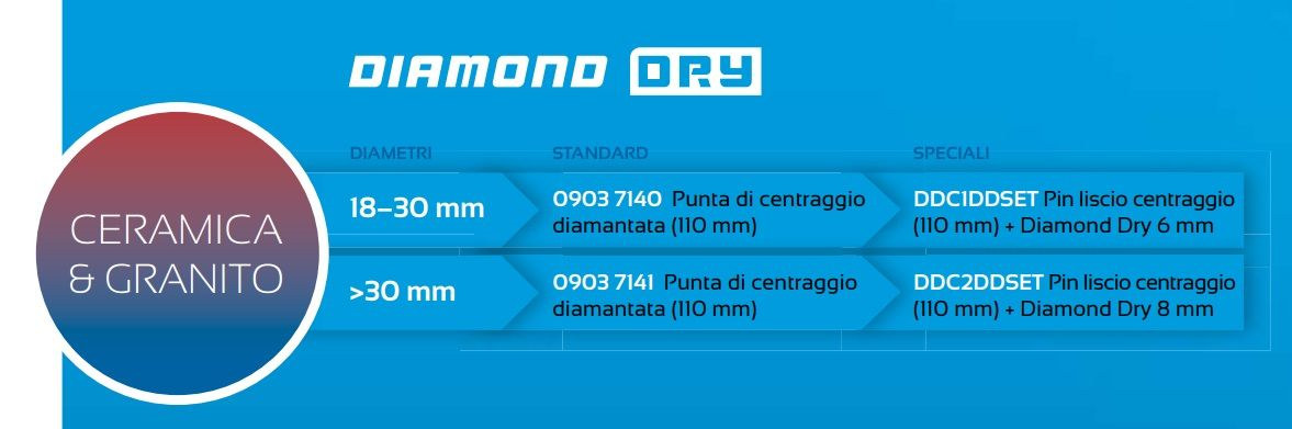 - Progettata per forare a secco in composito/ pietre naturali e piastrelle - Profondità di taglio 40 mm - Diamentri da 5 mm a 120 mm - Con sistema brevettato Click&Drill - Diametri da 5 a 16 mm anche con attacco M14 - L' uso della punta di centraggio evita lo slittamento