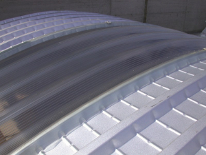 Realizzazione di lucernari , ottenuti mediante sovrapposizione laterale degli elementi traslucidi abbinati a pannelli metallici coibentati curvi.