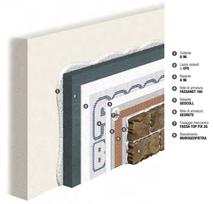 L'applicazione di FASSANET 160 avviene nel primo strato di rasatura. Dopo la stesura uniforme del rasante con la spatola metallica per uno spessore di 2-3 mm, si procede alla posa della rete d'armatura, avendo cura che il sormonto tra le strisce adiacenti sia di almeno 10 cn.