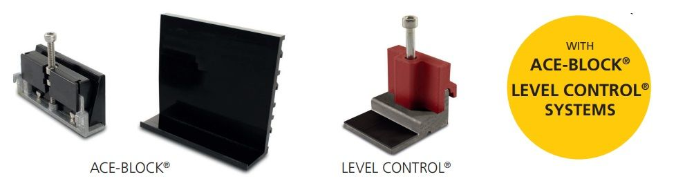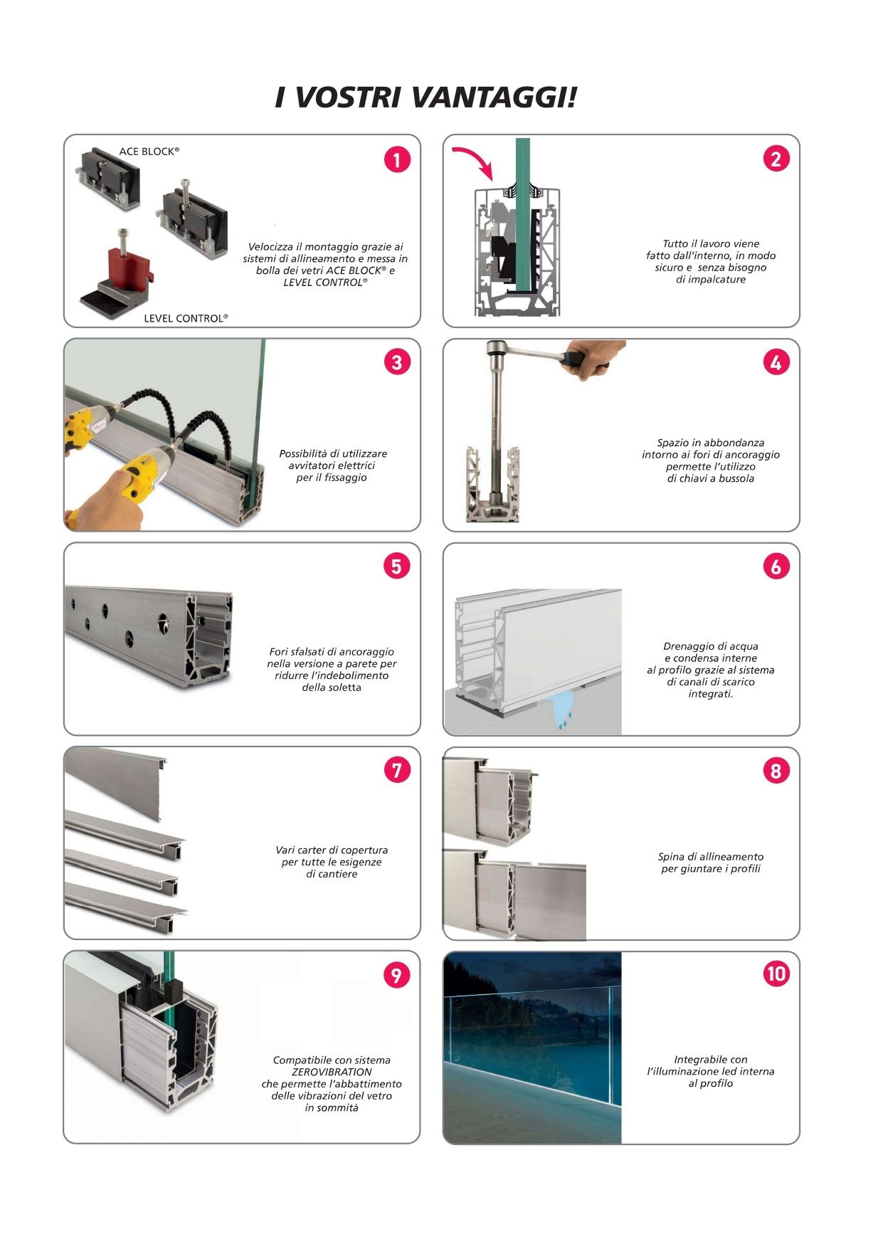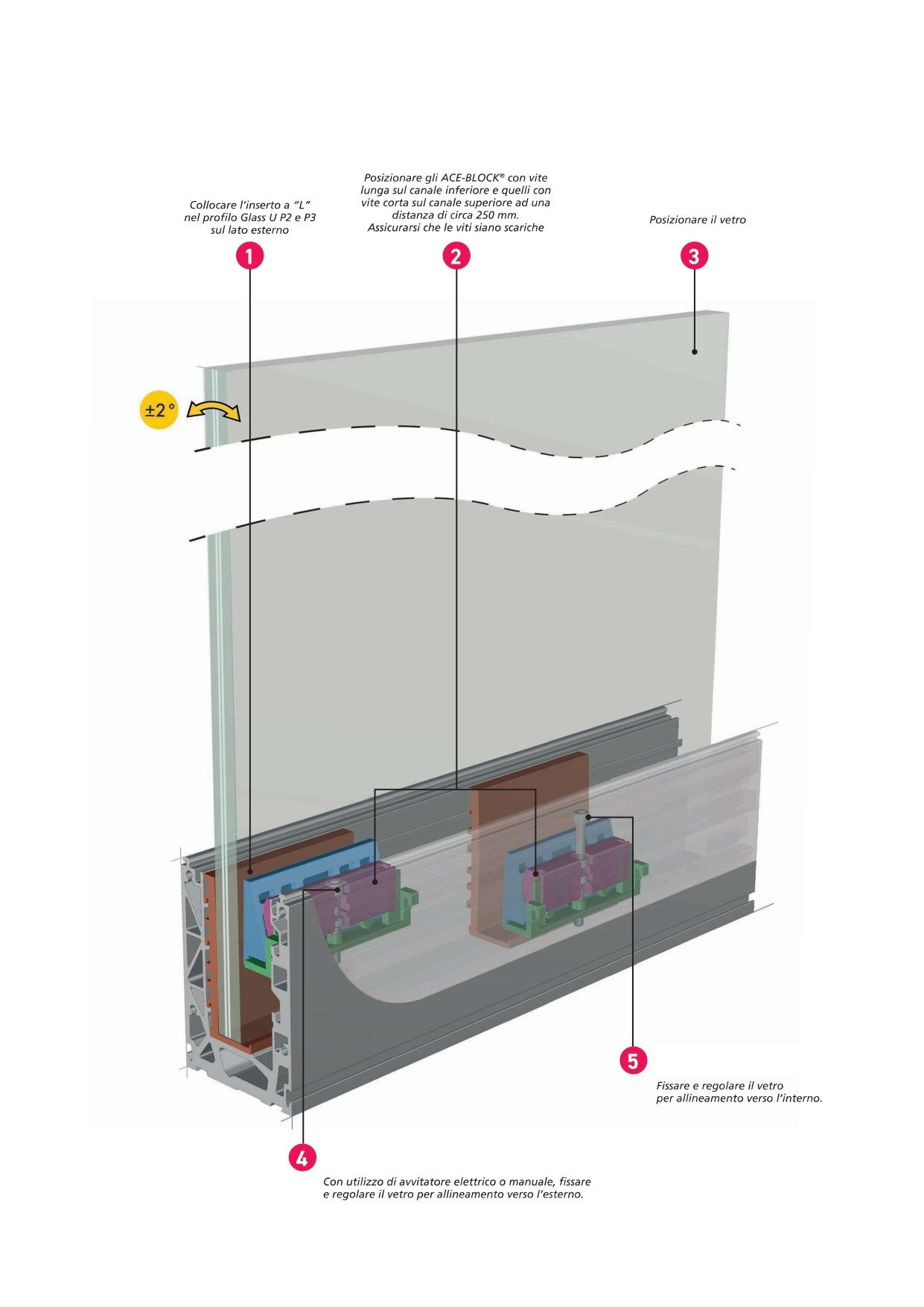 Glass-U P2 & P3 funzionano con gli innovativi sistemi di regolazione vetro ACE-BLOCK e LEVEL CONTROL. La regolazione del vetro è quindi semplicissima e arriva fino a 2° dall'asse verticale del vetro e 10 mm in altezza , per un controllo del vetro perfetto.