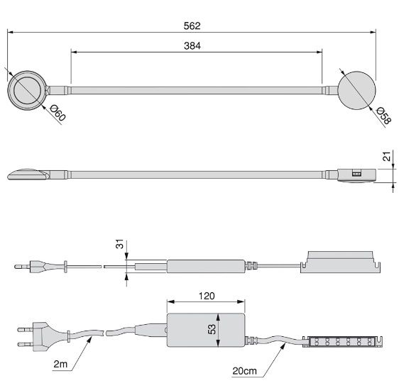 Questa lampada a muro si installa in modo semplice sulla superficie dei mobili mediante le viti di fissaggio fornite, che rimangono nascoste sotto il coperchio della base. Per il collegamento alla rete si fornisce anche un convertitore a tensione costante.